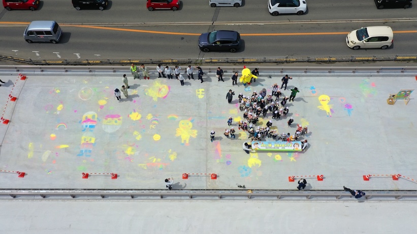 新加古川橋はまだ完成ではないですが、足場などは無くなっていてコンクリートの路面に小学生の皆さんがチョークで絵を描くというイベントでした。